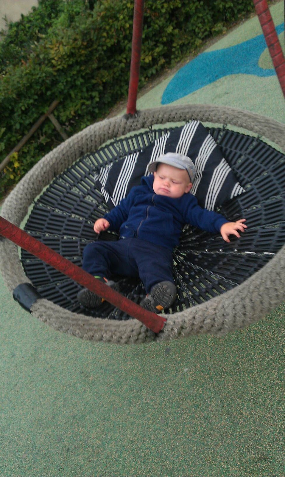 Den här gungan har Gordon verkligen inte tyckt om innan. Varje gång man har satt honom där så har blivit rädd och sagt nej nej nej. Idag när vi kom till lekplatsen så gick han fram till gungande och sa: nanna (sova) gungan, mamma! Hämtade kudden ur vagnen och sen fick jag gunga honom i nästan en timme! Han ville verkligen inte gå ur den. Tyckte den var supermysig.